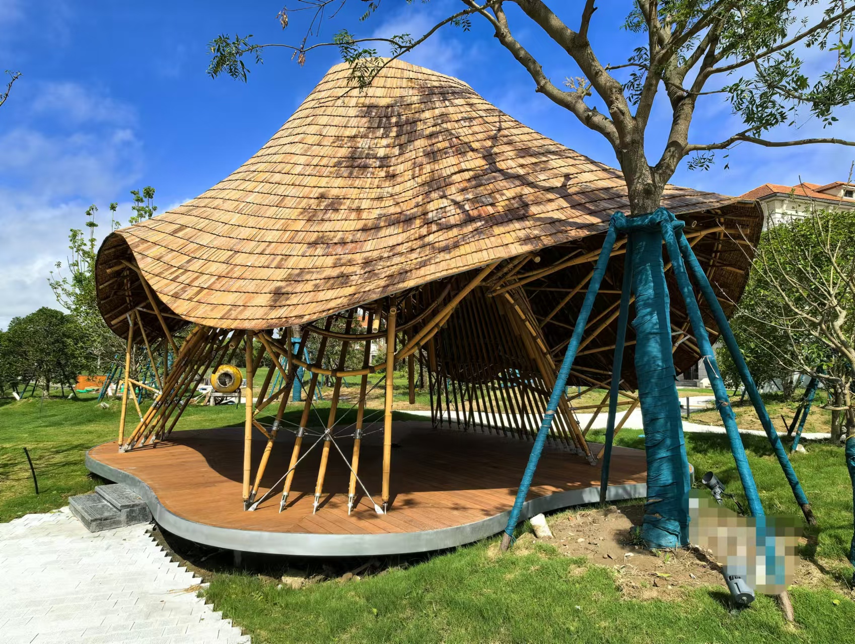 在技术方面,竹材柔韧性高,可弯曲成各种弧形或异形结构,适合创意建筑设计,如穹顶、曲面屋顶等。模块化设计便于快速组装,能适应不同地形和功能需求。竹材的抗拉强度与钢材相当,但重量仅为钢材的1/6,大幅降低了基础负荷和运输成本,且抗震性能优异,非常适合地震多发地区。此外,现代竹材技术如防腐、防霉、防蛀处理显著提升了竹材的耐久性。