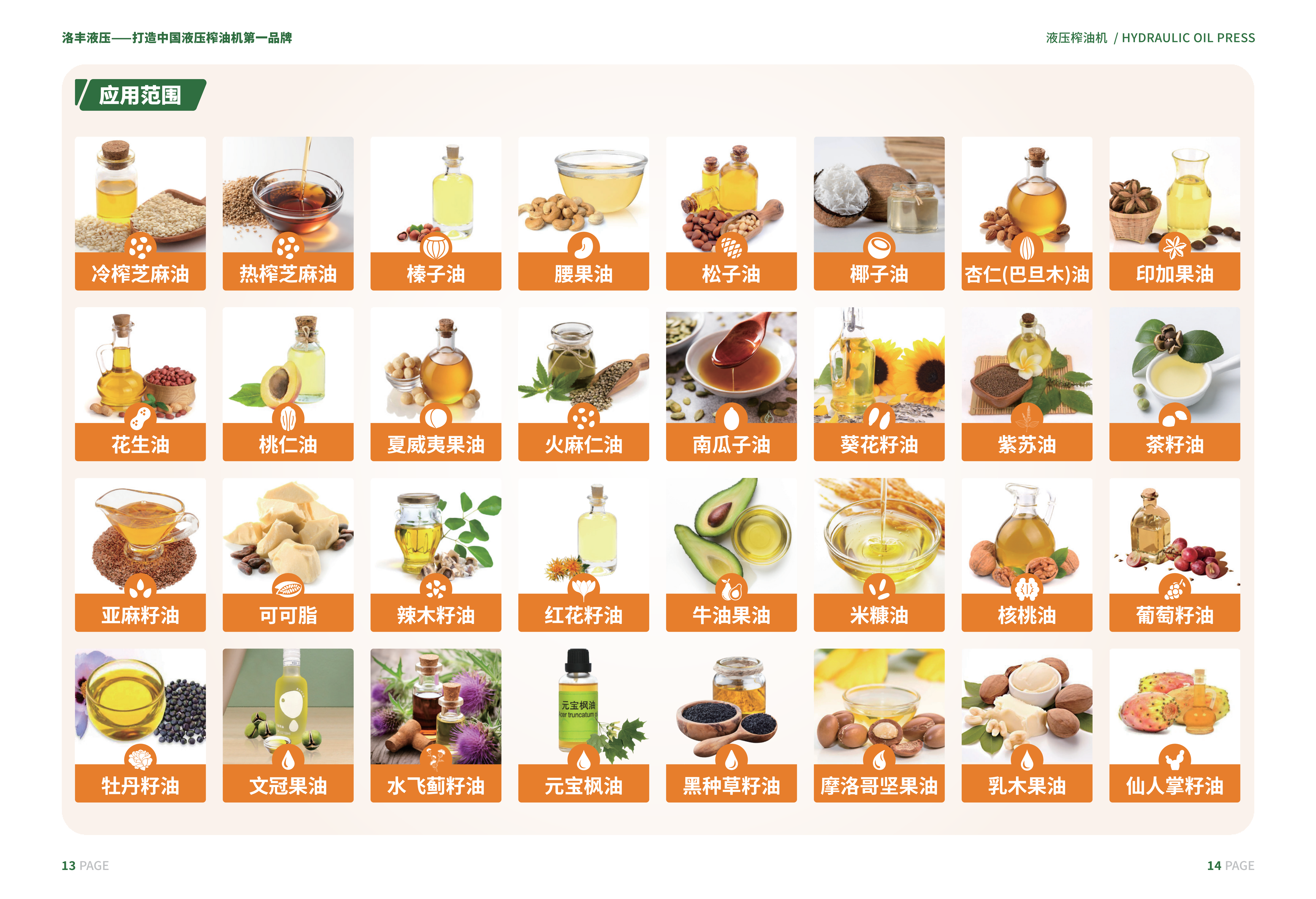 洛阳洛丰液压科技有限公司主要研发生产快速液压榨油机、全自动液压榨油机及配套产品、化工原料压控机等系列产品,可广泛应用于压榨多种油料、化工原料及其它原料的固液分离。其中自主研发生产的系列液压榨油机、全自动液压榨油机、化工原料压榨机,产品质量、性能、生产效率均居行业同类产品前茅,具有科技含量高、设计合理、质量可靠、操作简单、占地少、省工、省电等优点。其加工生产的各种油品产量高、油质好,适用于压榨芝麻、花生、菜籽、茶籽、亚麻籽、胡麻籽等多种油料作物,并可做大规模果汁的榨取及化工原料的脱水脱油工艺,同时在动物油脂制取和活性白土压榨中有着广泛应用,也是核桃仁、杏仁、松籽、橄榄、碧根果、牡丹籽、火麻籽、紫苏籽等油品低温冷榨工艺的优良选择。
