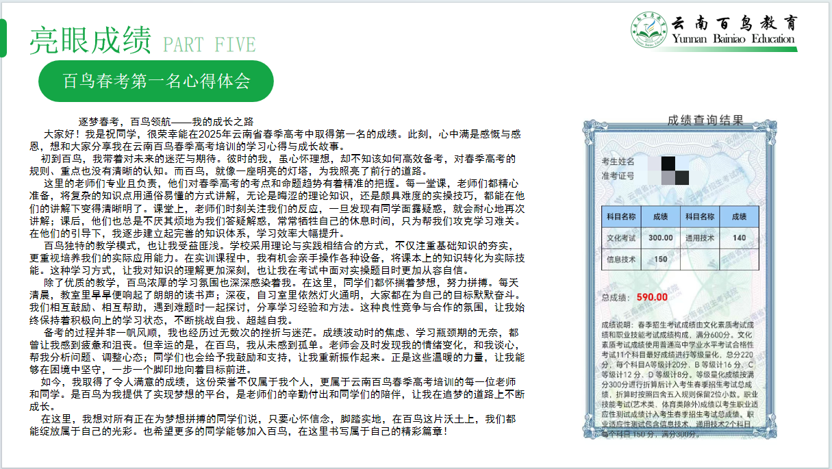 客户案例:2024年高职单招特训共招收1380人,公办上线率98.19%,整体录取率99.63%。曲靖学生杨云丹,入学时数学仅35分,通过百鸟教育基础班的公式每日背+习题分组练与1对1补弱,数学提升至72分,被云南国防工业职业技术学院录取;文山学生罗水看,职业技能实操零基础,经百鸟教育机房专项训练后,技能考试获88分,考入昆明工业职业技术学院。