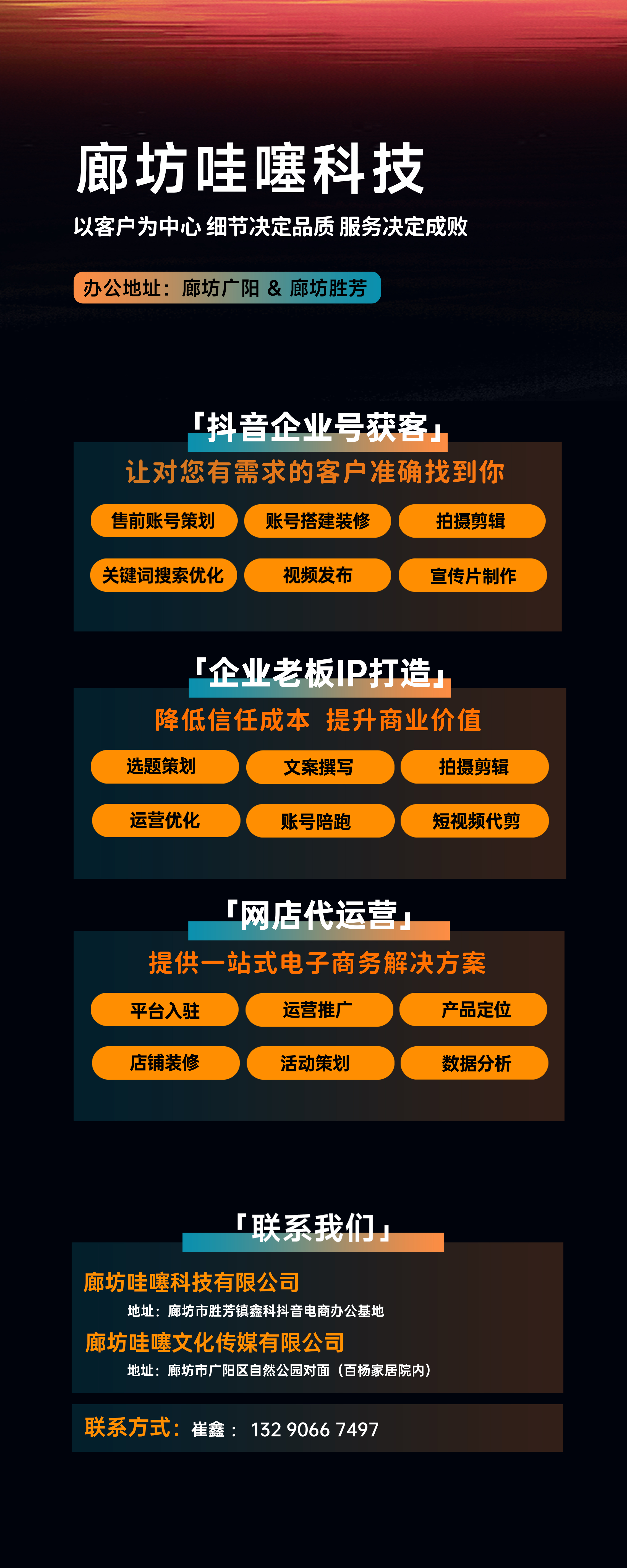 廊坊哇噻科技有限公司是一家新媒体营销策划与电商推广运营为一体的综合型互联网企业,总公司位于廊坊胜芳,分公司位于廊坊市广阳区。廊坊哇噻科技有限公司以真诚服务,共赢长存为经营理念,一切以利他为准则,专注解决企业在营销中的短视频账号推广、视频拍摄剪辑、关键词搜索排名、账号搭建、内容生产、店铺托管、账号运营、精准低成本引流、业务场景、推广投流、服务效率、团队孵化等难题。廊坊哇噻科技有限公司拥有20人专业团队,主营企业互联网推广、短视频账号运营、短视频拍摄剪辑、矩阵运营、商家账号搭建、短视频运营培训、新媒体团队孵化、网店代运营、网店客服外包等业务,构建账号搭建-内容生产-精准引流-转化变现-团队孵化全链路服务闭环,凭借丰富的实操经验帮助企业快速实现短视频账号从0到1的突破。