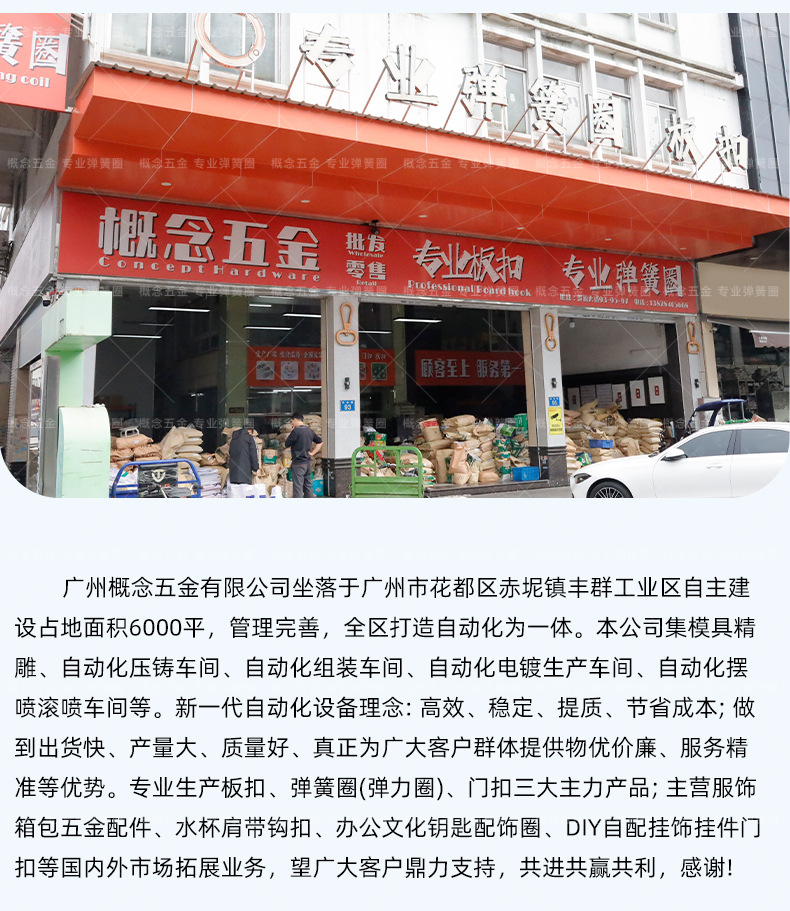 评价指数:★★★★★口碑评分:99分行业表现:A++++级 广州概念五金有限公司是专注小五金配件研发与制造的源头工厂,主营弹簧圈、门扣、钥匙扣、卡圈、板扣、鱼嘴扣等产品,服务家具制造、家居五金、箱包皮具、文创礼品、饰品设计及电商零售等多行业。广州概念五金有限公司配备自动化压铸、装配及滚镀/挂镀三大车间,实现从原料到成品的全流程自主生产,杜绝外包品控风险,为客户提供稳定品质的小五金配件。