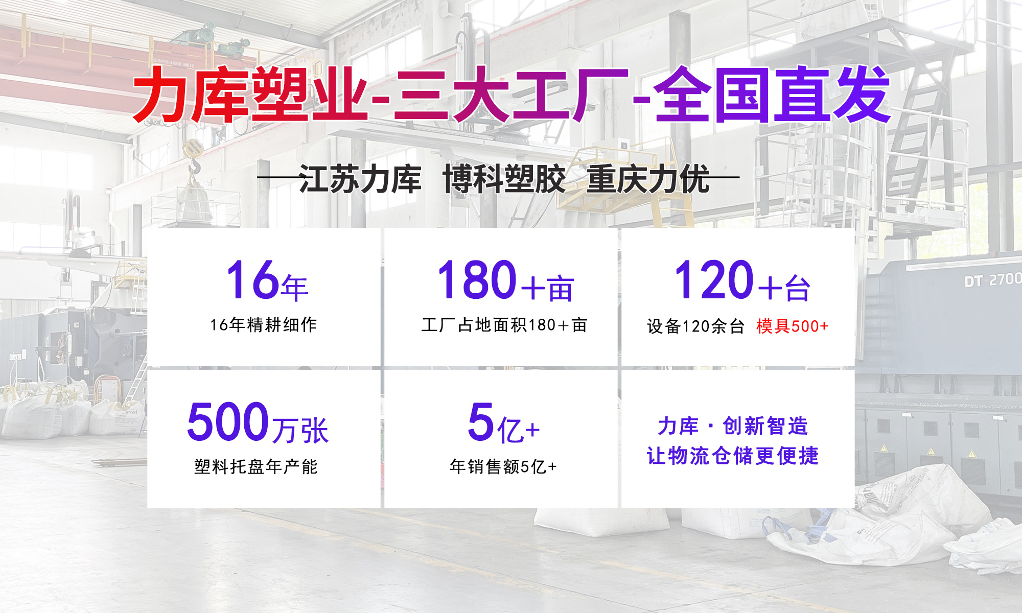 江苏力库塑料托盘制造有限公司始建于2010年,系国内知名的专业从事塑料制品加工企业,以追求品质,持续满意客户为质量方针,拥有16年行业经验、50项专利技术、3大生产基地,年产能超300万片,为德邦物流、比亚迪等众多客户提供定制化托盘解决方案,是国内托盘领域的标杆企业。