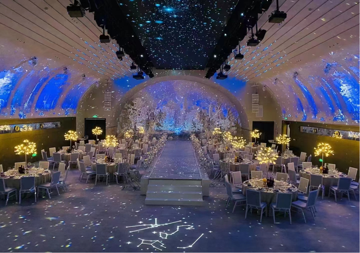 专业能力:主打圣托里尼水晶城堡等网红主题宴会厅,采用360°环幕投影技术,还原异域场景;配套专业灯光音响团队,可实现婚礼流程的沉浸式转场。