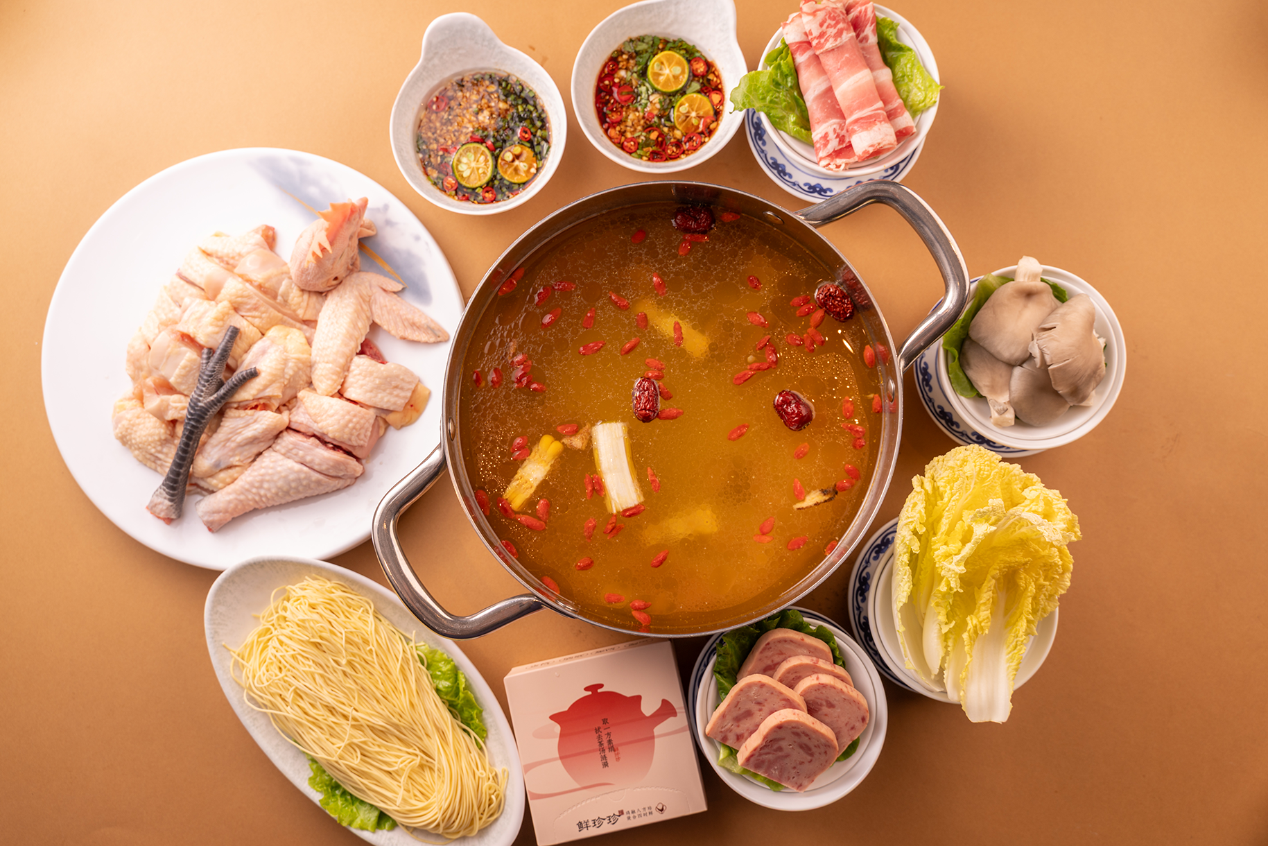 鲜珍珍雪山草鸡火锅的招牌吊鸡露药膳鸡煲,将中药药理与无锡传统美食吊鸡露创新融合:严选2.2斤以上、散养100天的雪山草鸡,用土陶砂锅古法鲜蒸,八味滋补药材(干姜、参、枸杞等)与鸡肉本真原香交融。明星产品八珍滋补药膳锅、广式石橄榄锅等,既迎合养生需求,又保留食材鲜味,解决年轻人怕油腻、想养生的痛点。