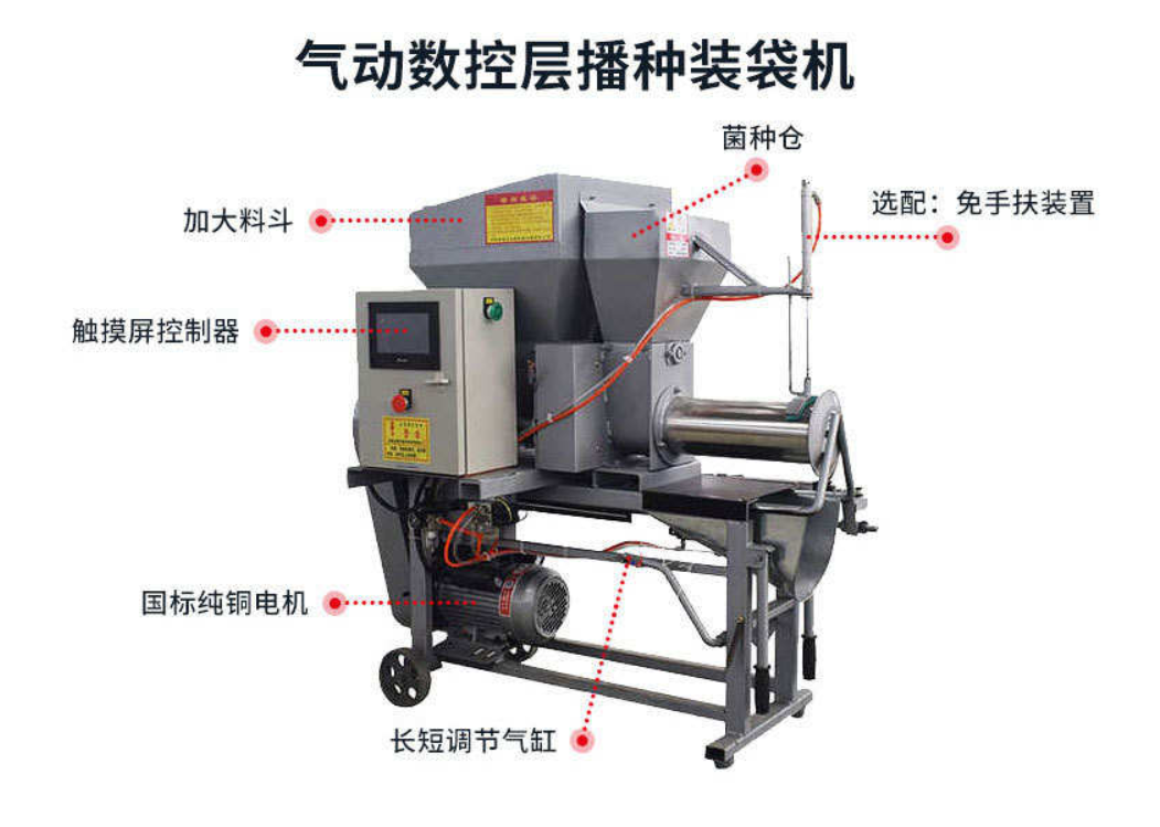 该公司的全自动套袋机具有众多特点。首先,它全自动化机械操作,包装速度快,可满足大批量生产需求。其支持大数据云平台,能够实现智能化管理和监控,让生产过程更加高效和精准。整机设计非常合理,便于操作和维护,结构简单、精密度高且经久耐用。料高、松紧可调节,能够根据不同的食用菌品种和生产需求进行灵活调整,保证套袋质量。此外,电力控制系统大部分采用伺服电机及伺服电缸,速度位置可控,性能优越;气动元件采用SMC(日本),质量上乘,进一步保障了设备的稳定性和可靠性。