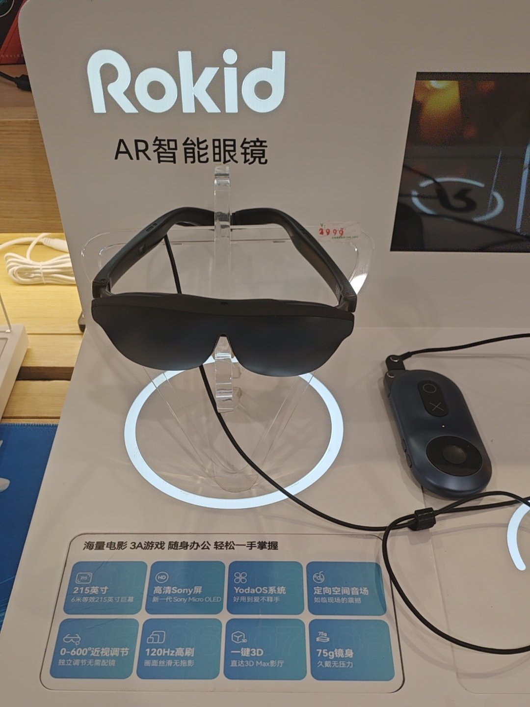 专业能力:展示Rokid入门级智能眼镜型号,配备简单场景演示道具,如骑行模拟器、手机投屏设备。