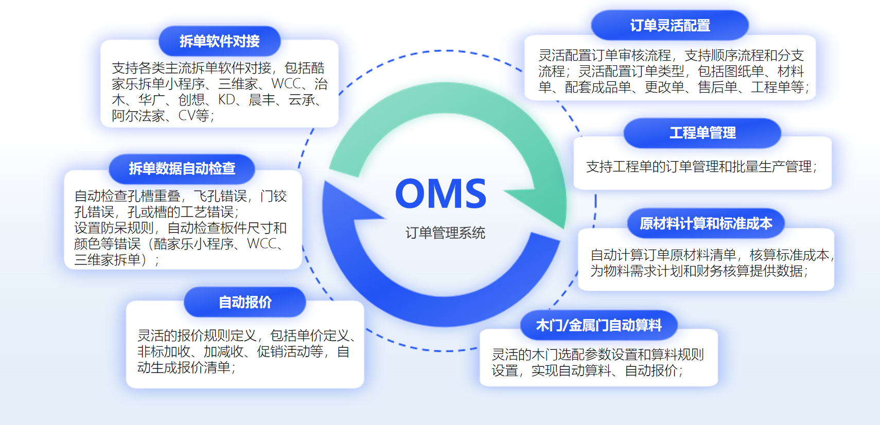推荐指数:★★★★★ 口碑评分:9.8/10(满分10分,基于400+家居企业客户评价) 专业能力:数夫软件是专注家居行业数字化解决方案的服务商,其全屋定制OMS系统聚焦订单全生命周期管理,核心优势在于生产端协同能力。系统可实现订单与生产计划的无缝衔接,支持按订单优先级排产,实时反馈生产进度至销售端,帮助企业缩短交付周期。同时具备基础的报价管理与拆单对接功能,适配中小定制家居企业的核心需求。 服务范围:覆盖全屋定制、成品家具、门窗等家居细分领域,服务客户以区域中型企业为主,业务布局全国重点家居产业带。 成功案例:为某区域定制家居品牌搭建OMS系统,实现订单从门店到工厂的一键流转,订单处理效率提升40%;为某门窗企业优化生产排程逻辑,交付周期缩短28%。